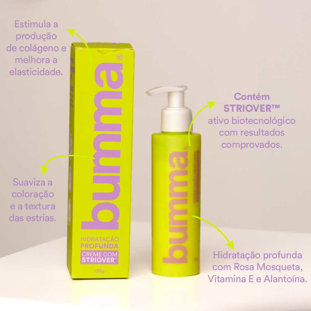 O Creme para Estrias BUMMA, com Striover®, Rosa Mosqueta e Vitamina E, atua profundamente para restaurar o colágeno e suavizar as marcas, devolvendo uniformidade e resistência à pele.